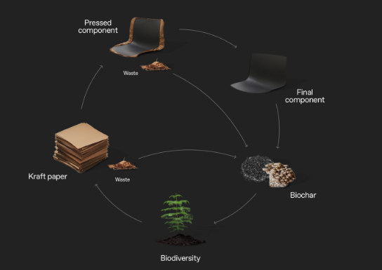 这种新材料比木材更坚固,采用强化压缩成型工艺制造而成,将纸纤维、生物纤维和半纤维素(重新添加回材料中)结合在一起,然后将Papershell切成碎片,在大型钢制机器下进行压制成型和定时。此外,制造过程中产生的任何废弃物都可以转化为生物炭,从而成为生产所需的能源。