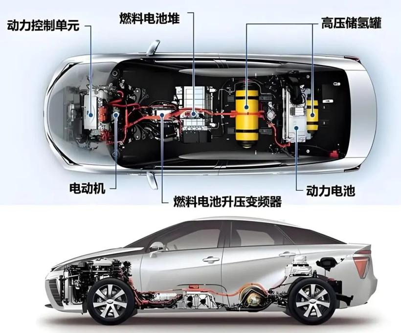主要构成是高压储气罐、氢燃料电池堆栈、动力电池组、驱动电机等。