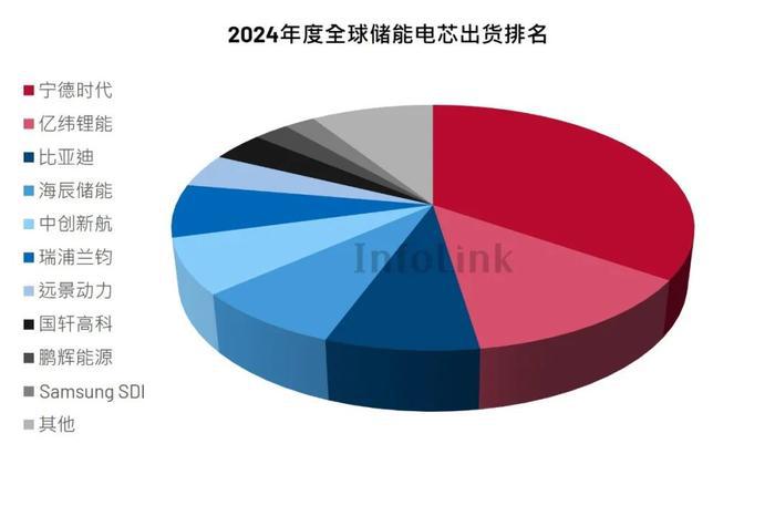 2024年度全球储能电芯总出货量 Top5 企业为宁德时代、亿纬锂能、比亚迪、海辰储能、中创新航。