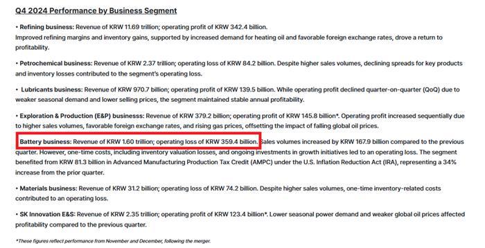 其中,SK On在2024年第四季度营业亏损达3594亿韩元,较2023年同期的186亿韩元亏损暴增近3400亿韩元,使得SK On的2024全年累计亏损更达1.127万亿韩元。