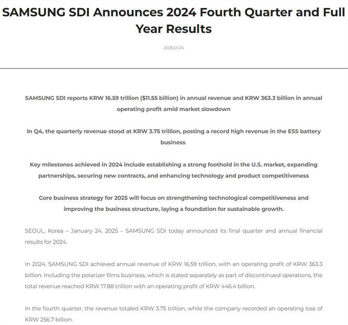 2024年第四季度,三星SDI亏损2567亿韩元,去年同期盈利2950亿韩元,由盈转亏,主要因产能利用率下降、新工厂固定成本增加及一次性费用。其中,2024年第四季度,三星SDI电池业务亏损为2683亿韩元。