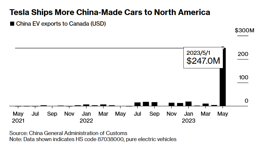 锐眼车盟讯 据外媒报道,今年5月,随着特斯拉首次开始向加拿大交付其在上海工厂生产的车辆,中国对加拿大的电动汽车出口量飙升。