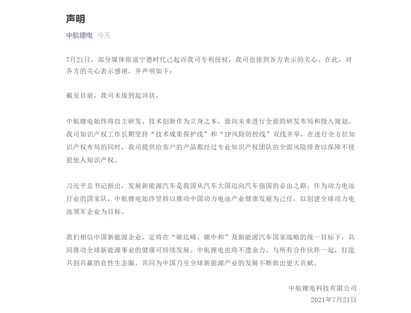 作为被起诉方,中航锂电当天晚间发布声明回应宁德时代起诉其专利侵权,称截至目前,该公司未接到起诉状。