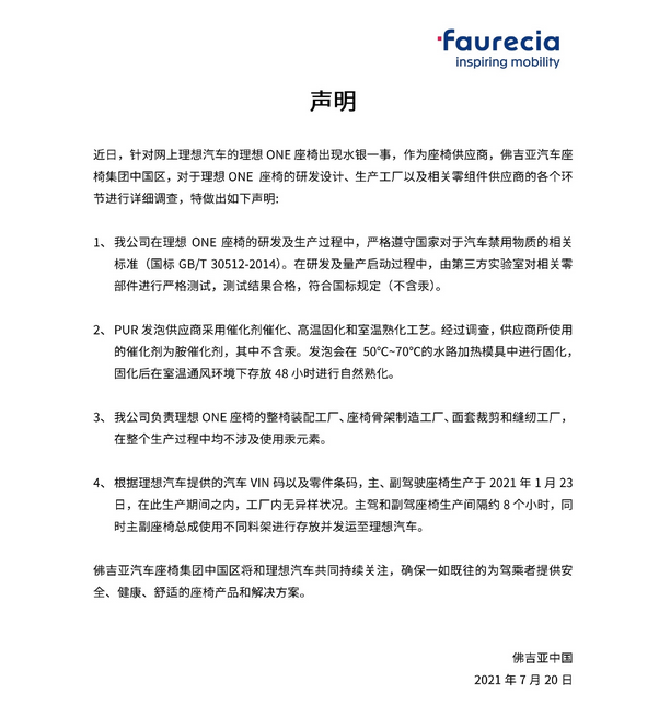 针对这一推测,理想ONE座椅供应商佛吉亚汽车座椅集团中国区于当天下午公开声明回应,在经过对理想 ONE 座椅的研发设计、生产工厂以及相关零部件供应商的各个环节进行详细调查,并由第三方实验室对相关零部件进行严格测试,测试结果合格,符合国标规定(不含汞)。