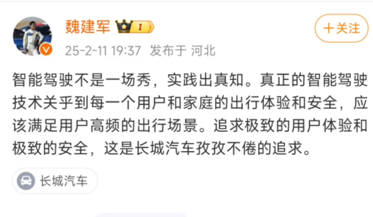 近日,长城汽车多位高管在微博上纷纷针对智能驾驶技术发表了真知灼见,强调智能驾驶不是虚头巴脑的概念,而是需要实践来检验的真功夫。