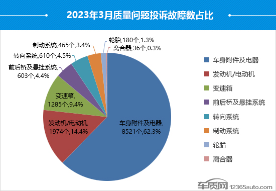 在3月份车质网受理的质量投诉中,车身附件及电器迎来爆发,投诉故障数环比上涨30.4%,占比提高了5.1个百分点,投诉增量来自于部分自主和日系品牌车型。此外,发动机/电机的投诉故障数环比也有明显增长,较2月份上涨12.4%。
