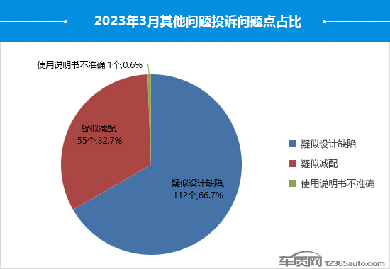 3月份,其他问题投诉量出现反弹,疑似设计缺陷依旧是占比最高的投诉问题,投诉问题点环比上涨55.6%,投诉集中在部分美系品牌车型。