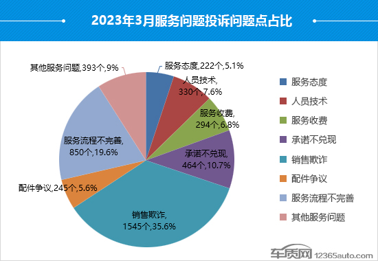 3月份,服务问题的投诉分布再次发生变化,销售欺诈接棒服务流程不完善成为投诉占比最高的服务问题,具体表现为“与宣传不符”,投诉主要来自于德系和自主品牌车型。此外,人员技术的投诉问题点数量和占比也较2月份有所增长。
