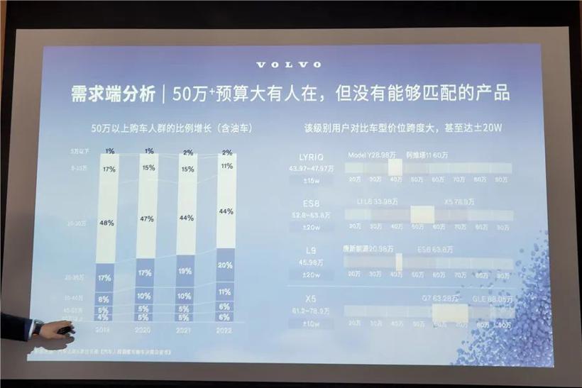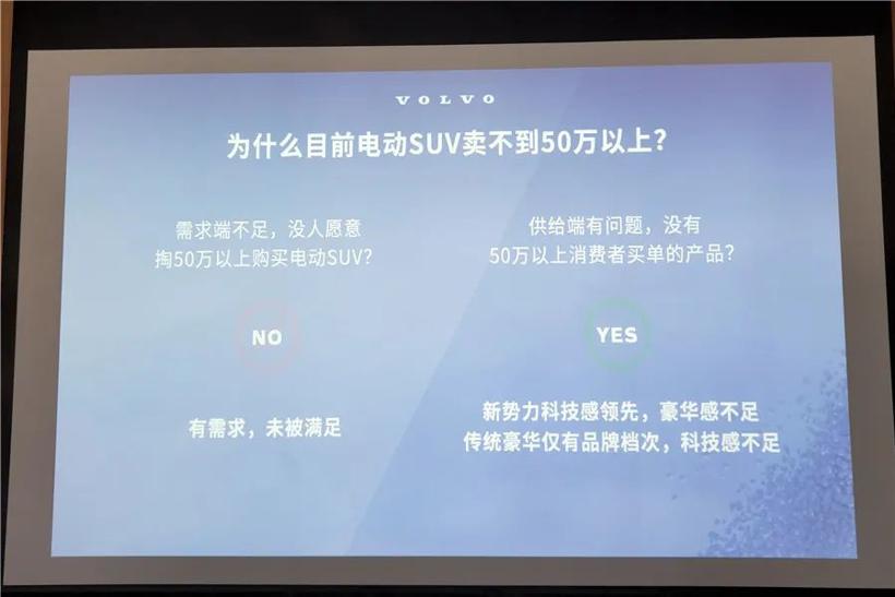对50万以上的市场来说,整体销量规模在提升,但电动车占比很低。沃尔沃认为,50万预算以上消费群体需要的是可信赖、豪华感和科技感,但现阶段没有能够匹配的产品。