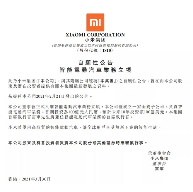 3月30日,小米集团在港交所发布公告称董事会正式批准智能电动汽车业务立项。