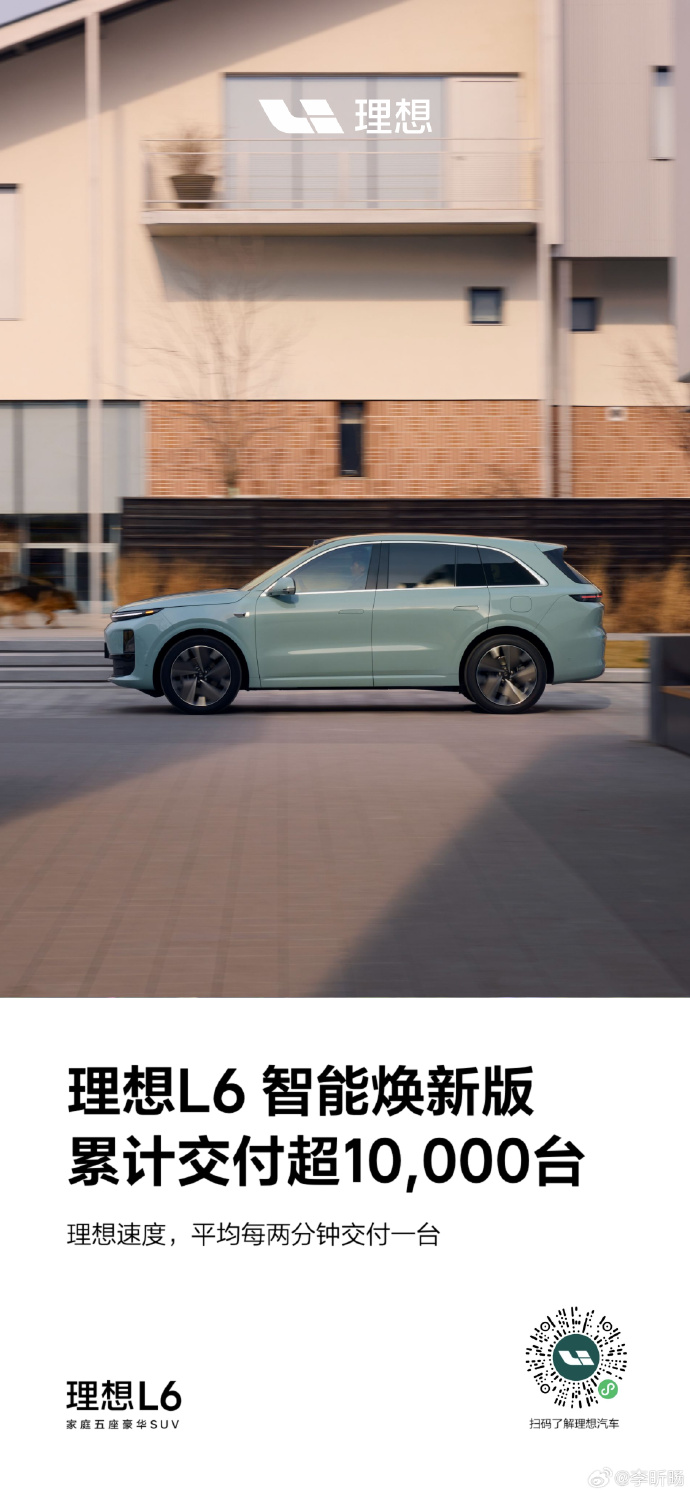 5月26日晚,理想汽车产品线负责人李昕旸宣布,理想L6智能焕新版车型累计交付超10,000台,平均两分钟交付一台。