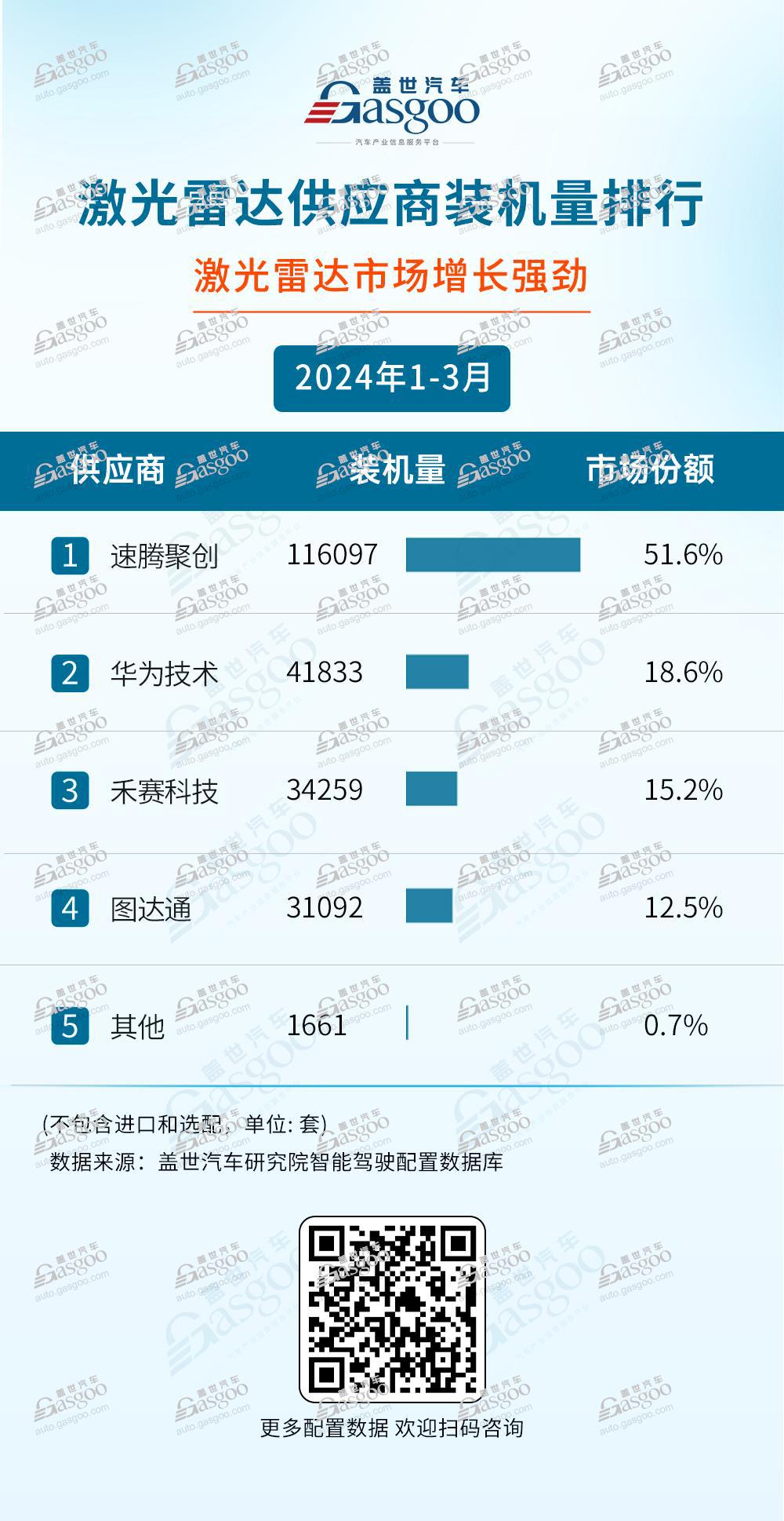 根据锐眼车盟研究院智能驾驶配置数据库显示,2024年1月至3月,速腾聚创激光雷达装机量达11.6万台,以51.6%的市场份额位居榜首;华为技术紧随其后,装机量为4.2万颗,占据18.6%的市场份额,位居第二;禾赛和图达通占据三、四名的位置,市场份额,分别为15.2%和12.5%。
