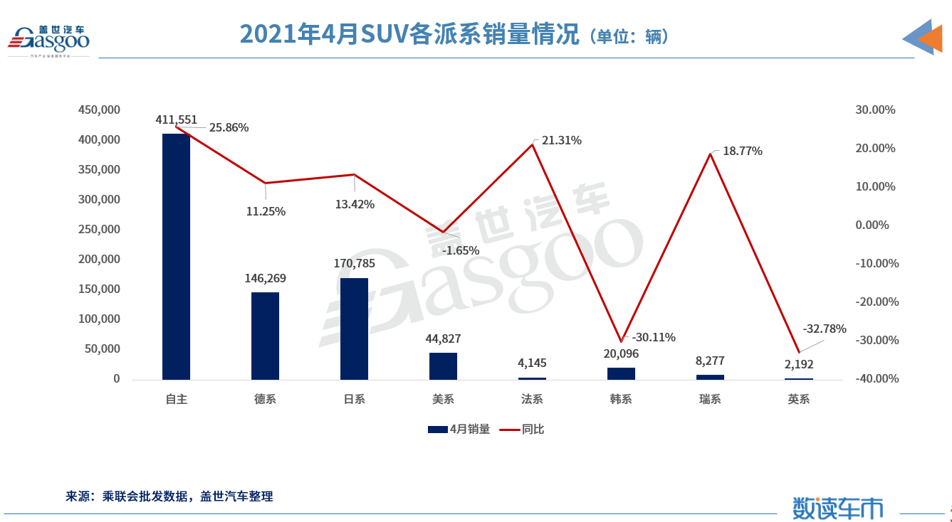 SUV市场今年以来再现强劲增长态势,背后离不开各大派系的集中发力。据锐眼车盟研究院整理的数据显示,在SUV主流派系中,自主、德系、日系4月SUV销量均有较大增幅,其中,自主品牌4月SUV销量为41.2万辆,同比增长25.86%;德系和日系的增幅也在10%以上。