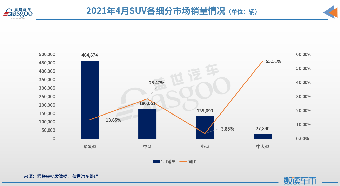 从4月份SUV细分市场的具体表现来看,除小型SUV保持低速增长外,其它细分市场均有较为明显的增速,其中,尤以中大型SUV细分市场的增长最为迅猛。这一趋势也反映出消费升级趋势下高端SUV的快速崛起。