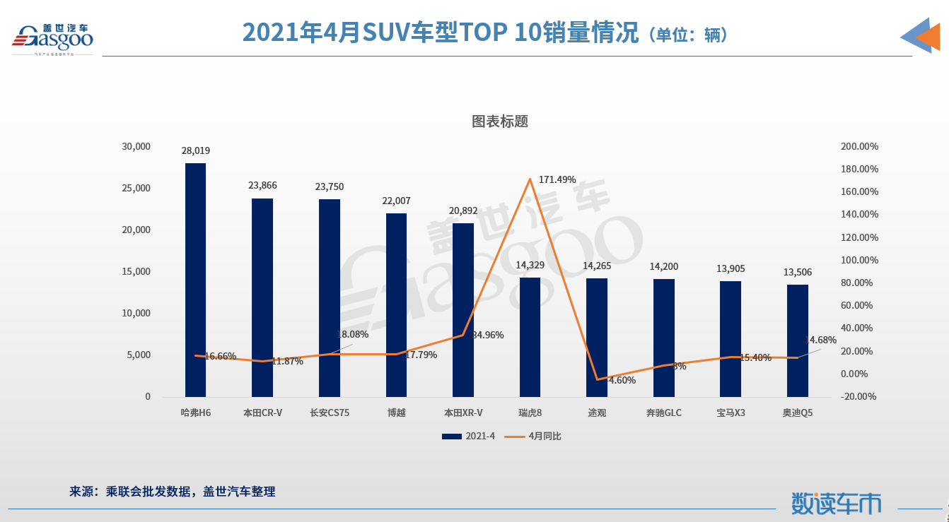 入围4月SUV销量排名前十的合资品牌车型中以日系和德系见长,如东风本田旗下的CR-V和XR-V两款车型4月销量双双进入2万辆俱乐部;德系品牌中,仅途观4月销量有所下滑,入围的其它三款豪华车4月销量均有不同程度的增长。其中,奔驰GLC以1.42万辆的单月表现位列豪华SUV之首。