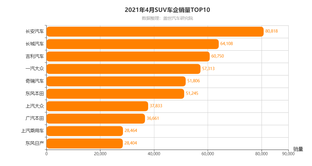 细分到各大车企和车型来看,SUV销量在合资和自主品牌领域又呈现出更为微观的变化趋势。在4月SUV车企销量TOP 10排名中,自主三巨头,长安、长城、吉利分别位列这一榜单的前三甲。其中,长安汽车4月SUV车型销量超过8万辆,长城和吉利也均进入了6万辆规模范围。其它自主品牌如奇瑞、上汽乘用车也进入了SUV车企销量前十榜单。